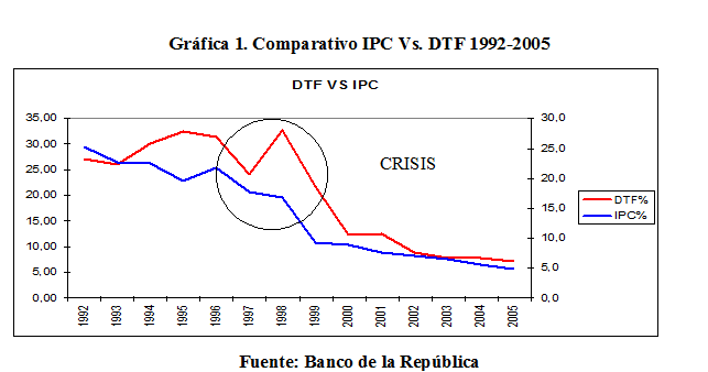Al aumentar las tasas de interés, la tasa DTF presentó un crecimiento desproporcionado, afectando directamente la UPAC y causando un daño irreversible en la estructura de este sistema, por lo cual muchos usuarios no pudieron pagar a tiempo sus créditos, debido principalmente a que sus ingresos se ajustaban al Índice de Precios al Consumidor (IPC) y sus créditos a la DTF y esta se encontraba en niveles muy superiores al IPC (ver Gráfica 1).