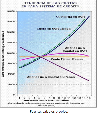 A continuación se presenta una gráfica con las tendencias de cada una de los sistemas de amortización donde se puede observar que: la cuota fija en UVR (cuota baja) aumenta todos los meses de acuerdo con la inflación y nunca disminuye, siendo un sistema muy costoso; el abono fijo a capital en UVR (cuota media) es el sistema más económico, ya que después de la mitad de la vida del crédito el valor de las cuotas disminuyen; cuota en UVR cíclica (cuota estable) en este sistema las cuotas nunca disminuyen y las mensualidades aumentan cada año de acuerdo con el índice anual de inflación; abono fijo a capital en pesos, las cuotas son un poco más altas al comienzo pero luego comienzan a bajar, desde la primera cuota el aporte a capital es bastante alto por lo que resulta ser la opción más económica; cuota fija en pesos, la cuota es idéntica de principio a fin, sin embargo el aporte a capital es gradual lo que resulta un poco más costoso, por efecto de los intereses (note que el costo es muy similar al de la cuota media en UVR).